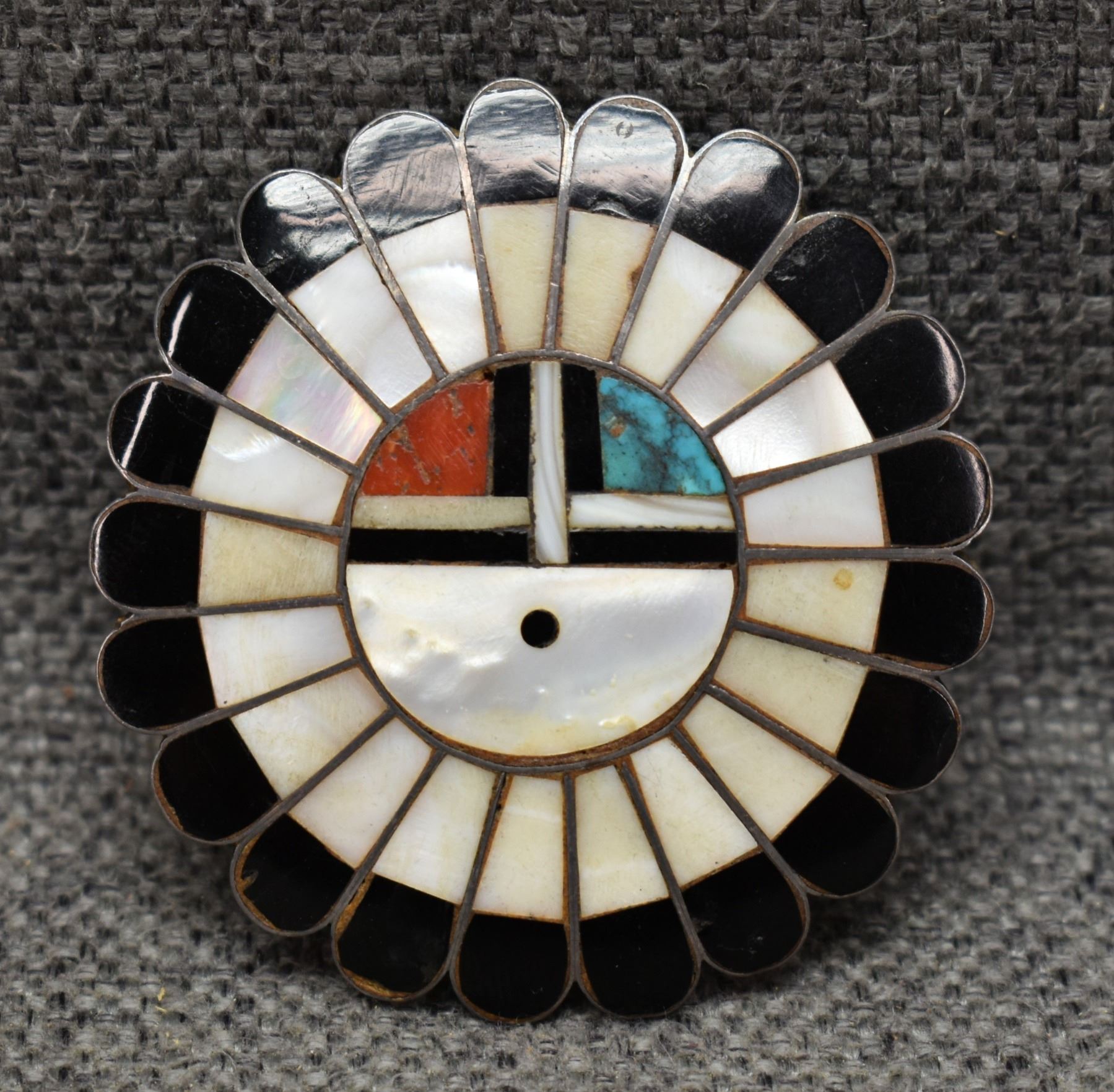 1960's Zuni, sterling silver channel inlaid shell turquoise coral and Jett sun face design 2.25" diameter total weight 23 grams