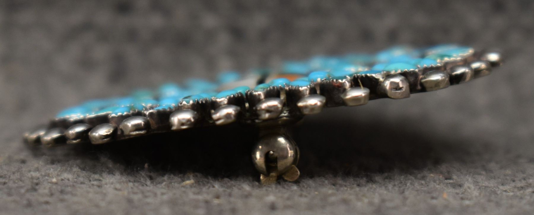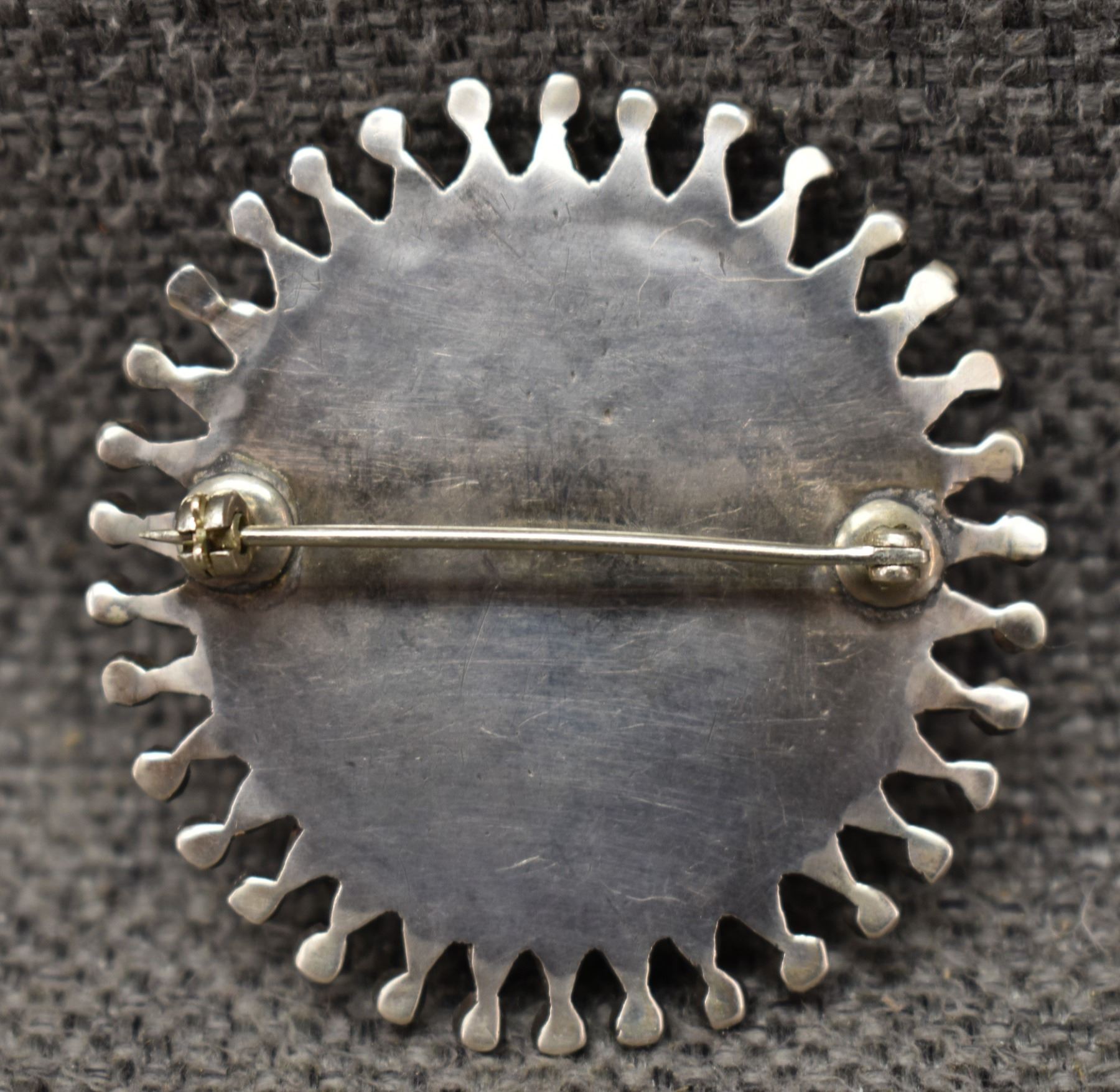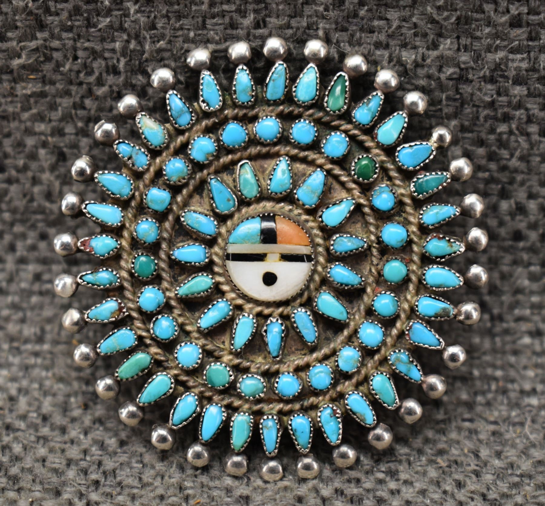 1960's Zuni. Sterling silver turquoise and shell depicting sun face. 2'' dia. Total weight 16 grams