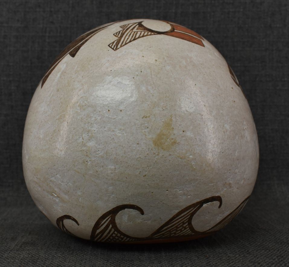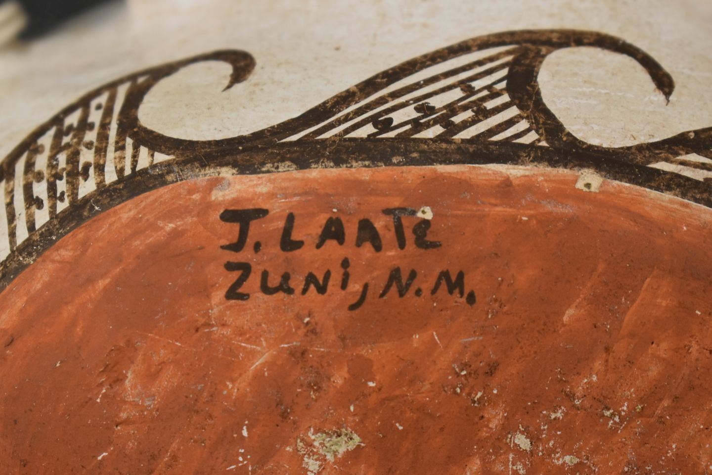 1950-60s Zuni, hand coiled with polychrome painted design signed J Laate 6.5" x 7.5" x 8"