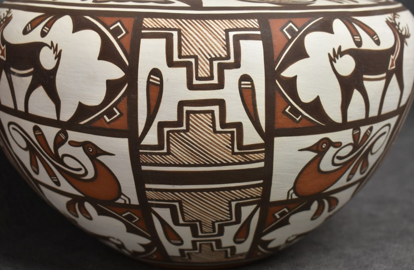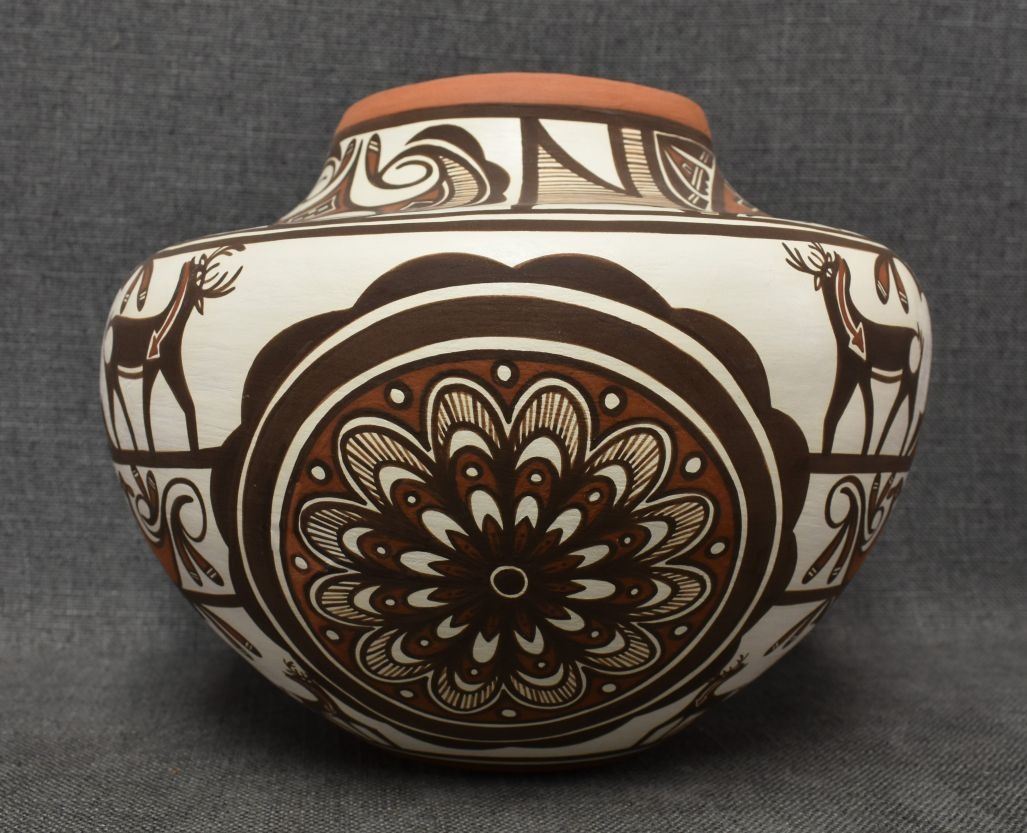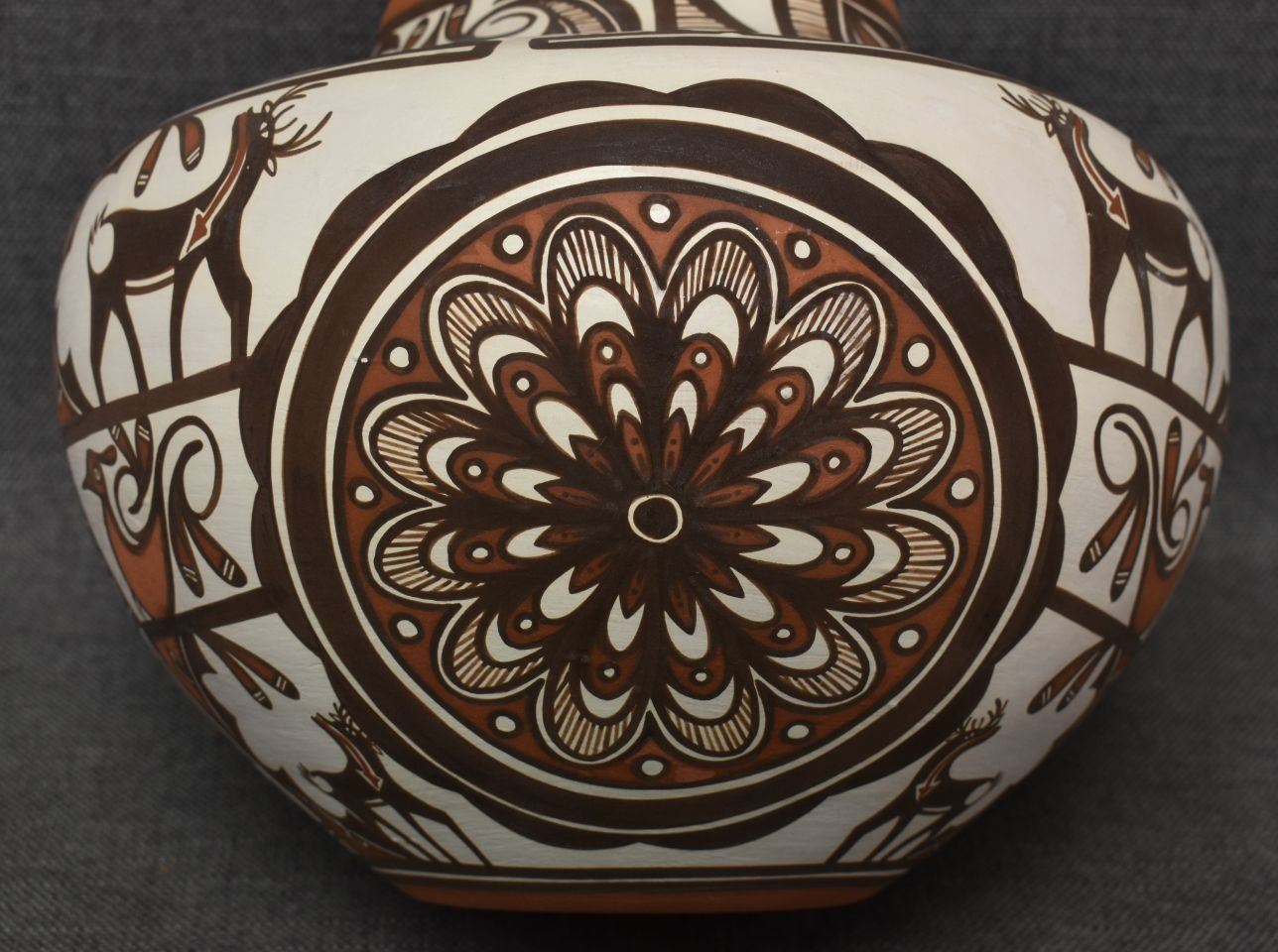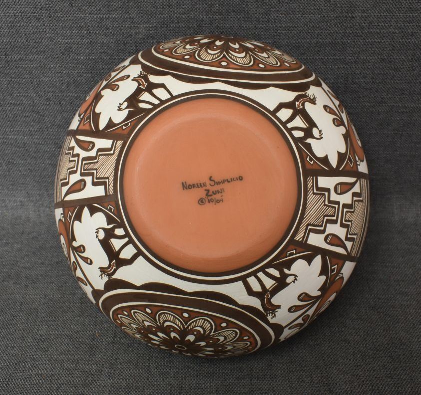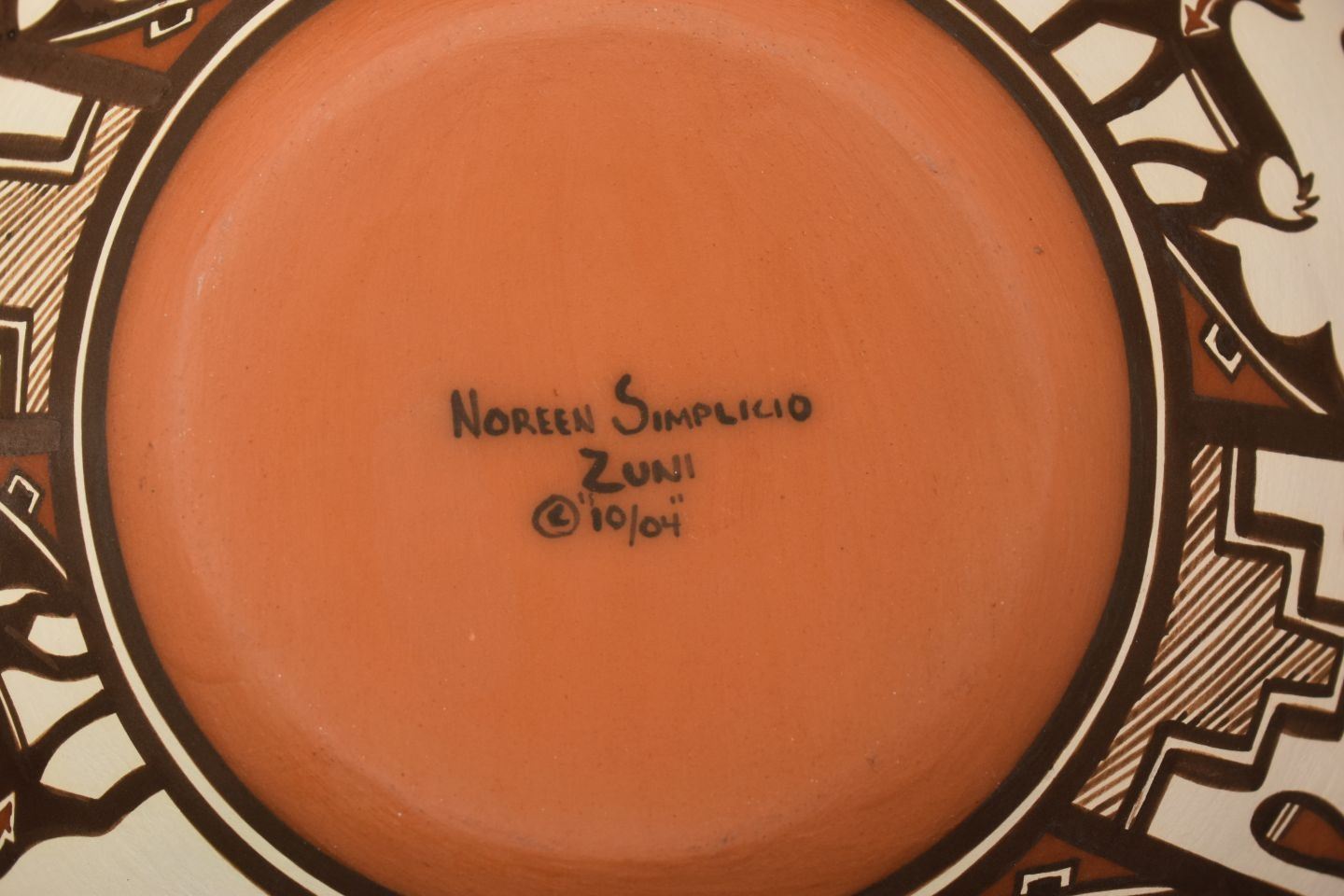 2004 Zuni, Hand coiled with polychrome painted heartline deer and floral design signed Noreen Simplicio. 9'' x 11''