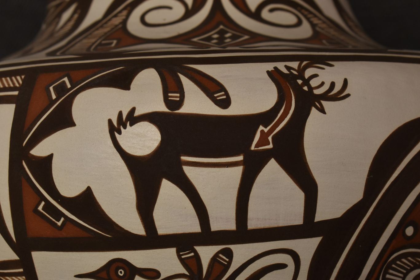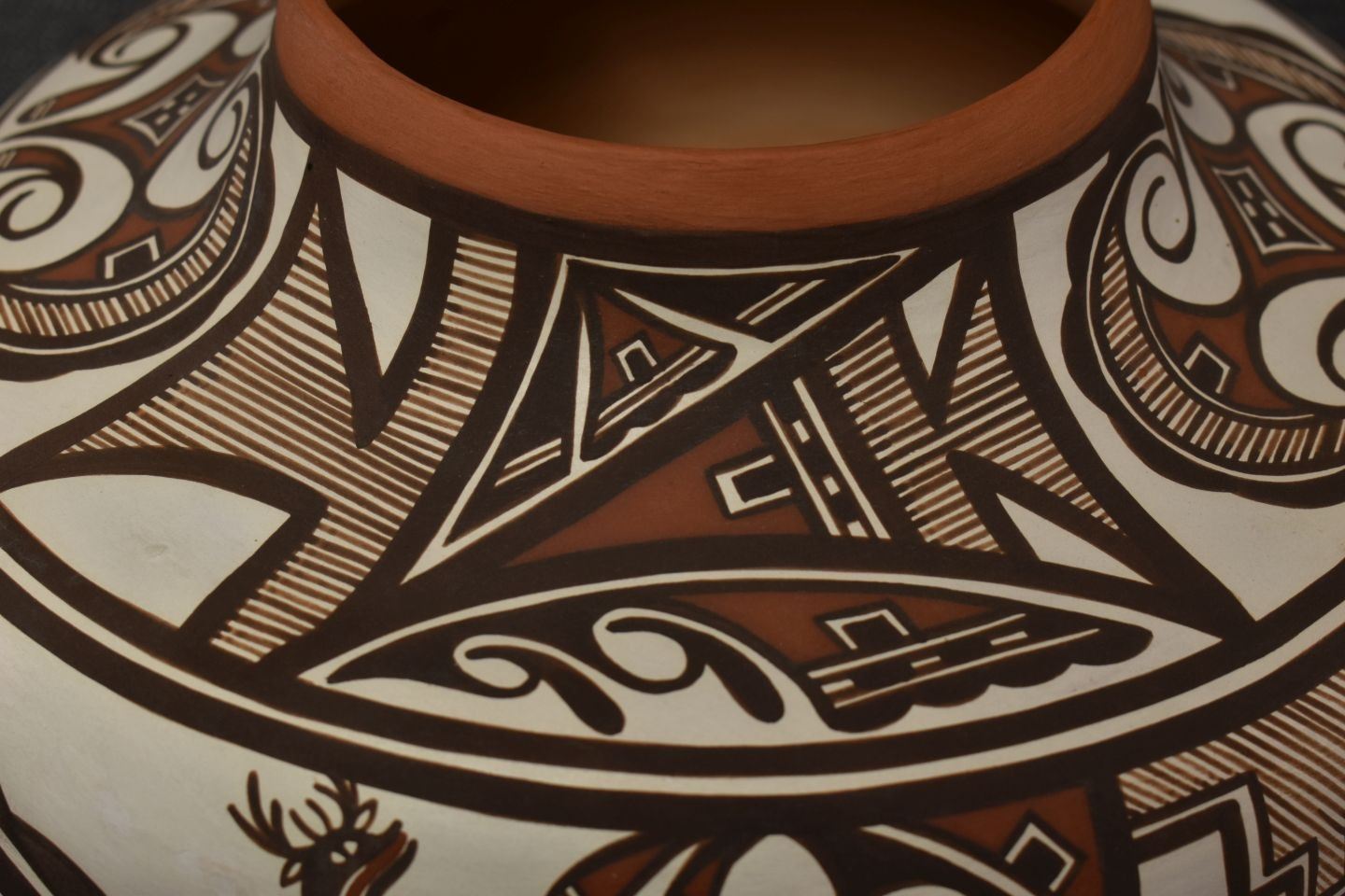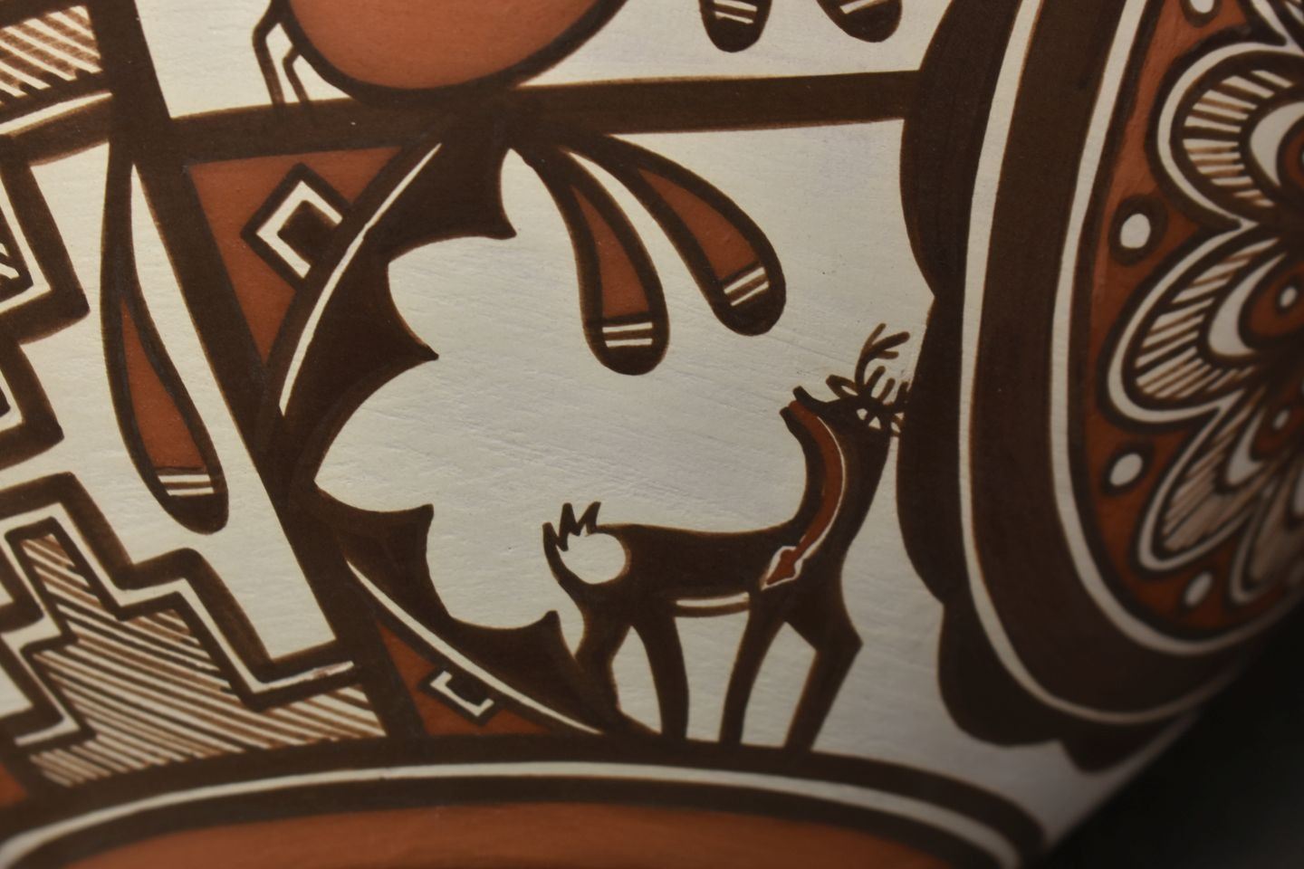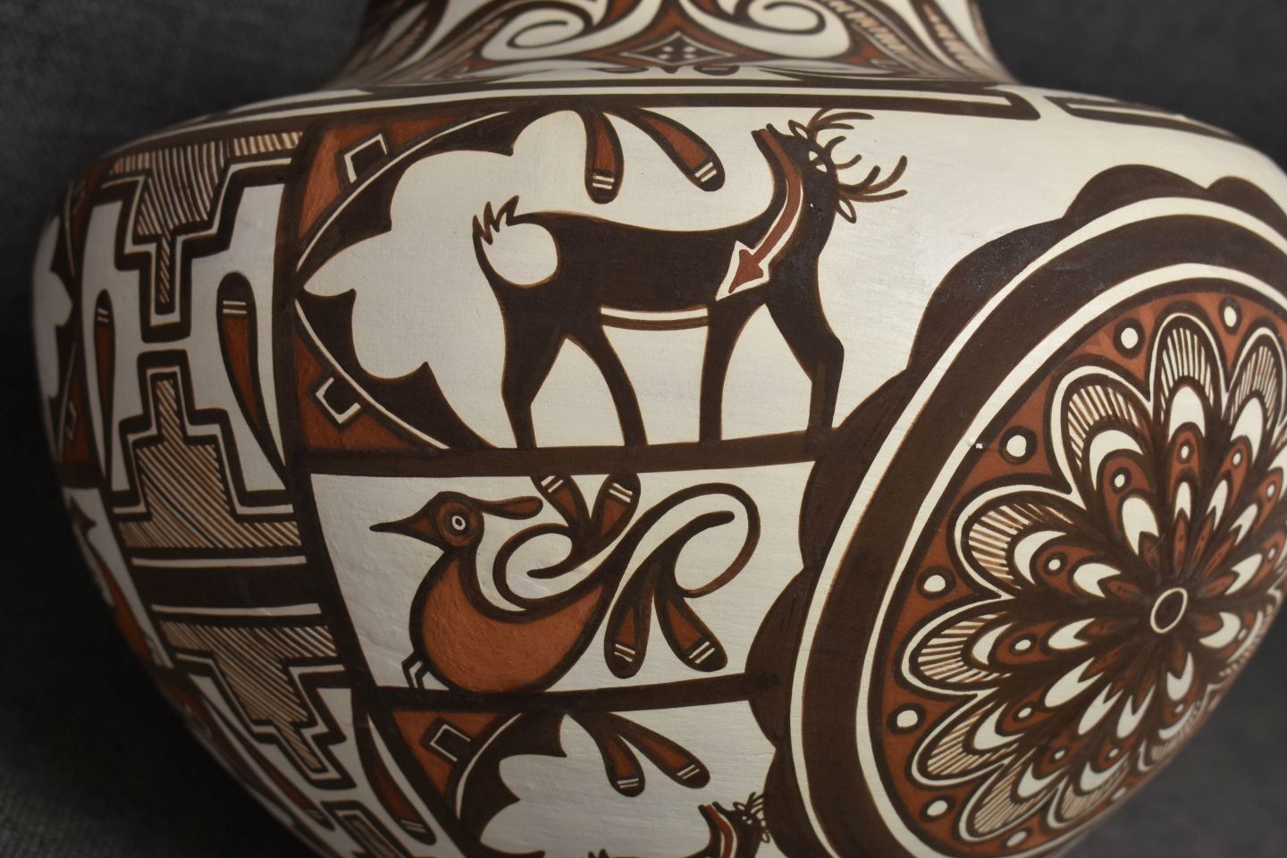 2004 Zuni, Hand coiled with polychrome painted heartline deer and floral design signed Noreen Simplicio. 9'' x 11''