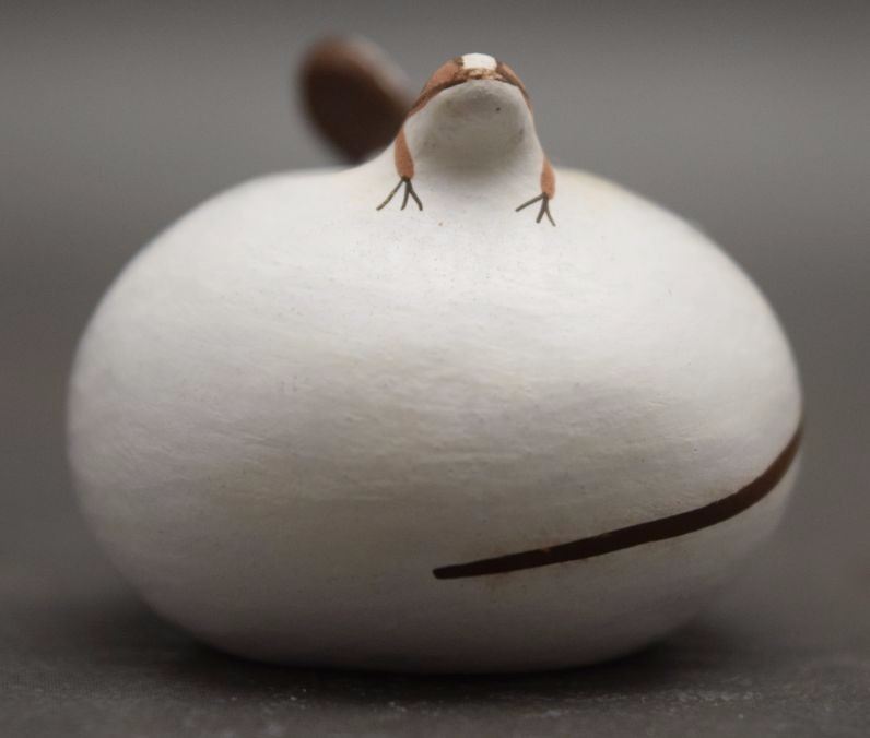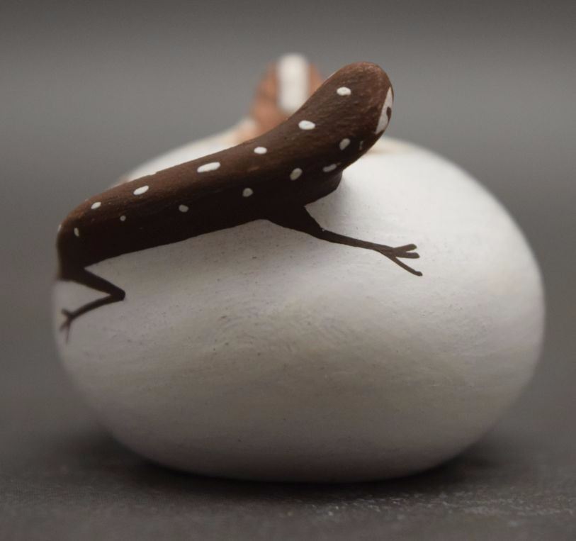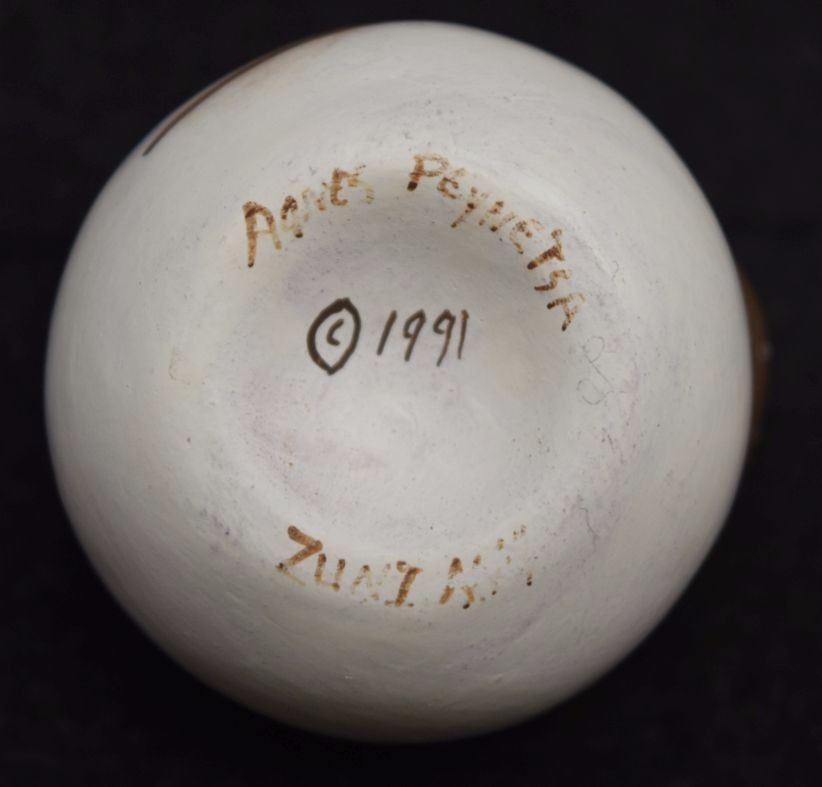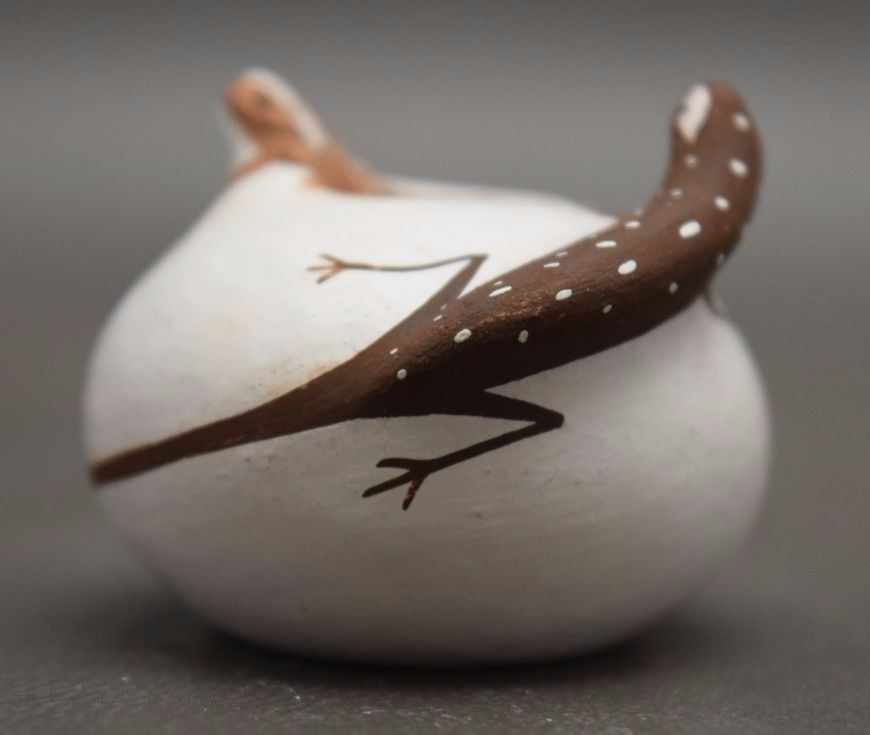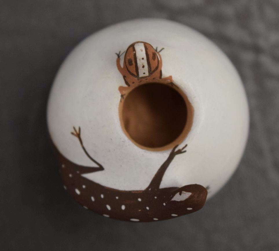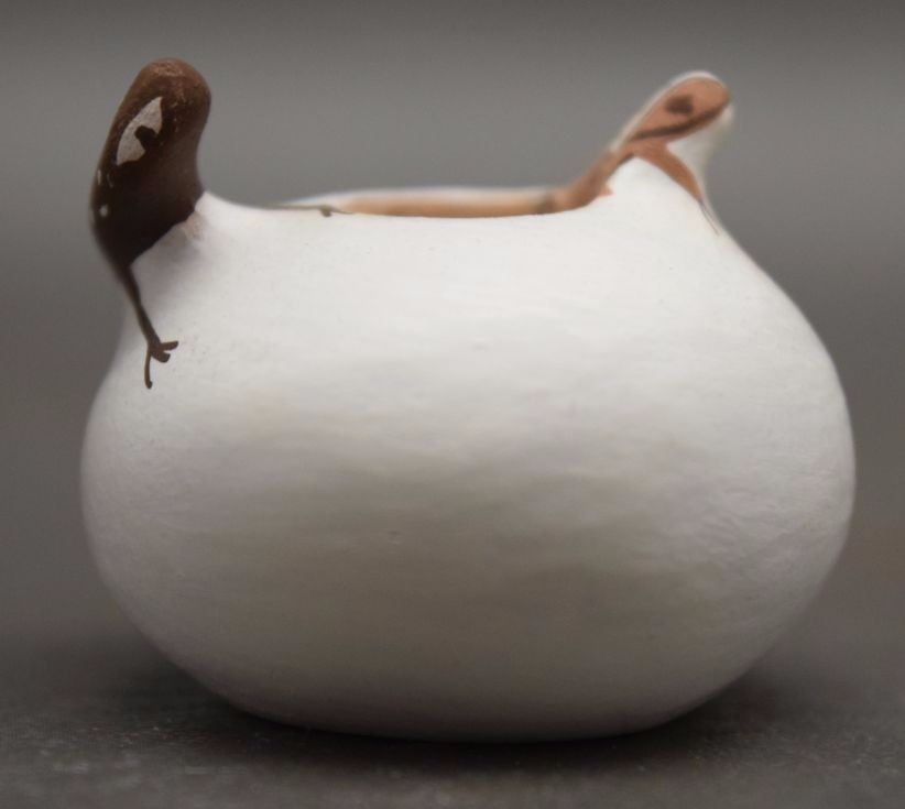 1991 miniature pottery olla with lizard and frog on rim . signed Agnes Peynetsa 1'' x 1.25''