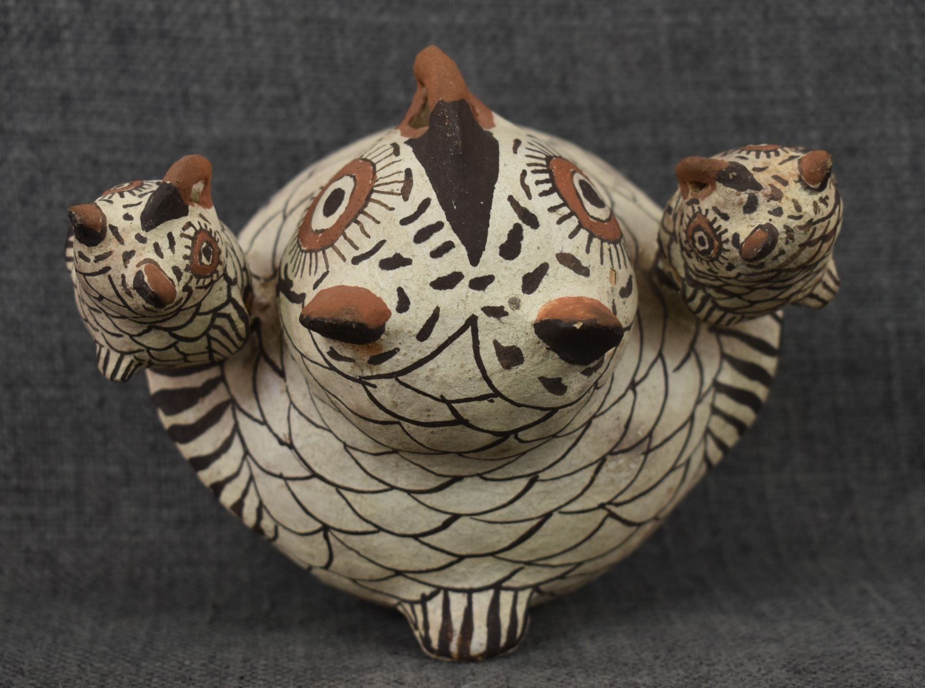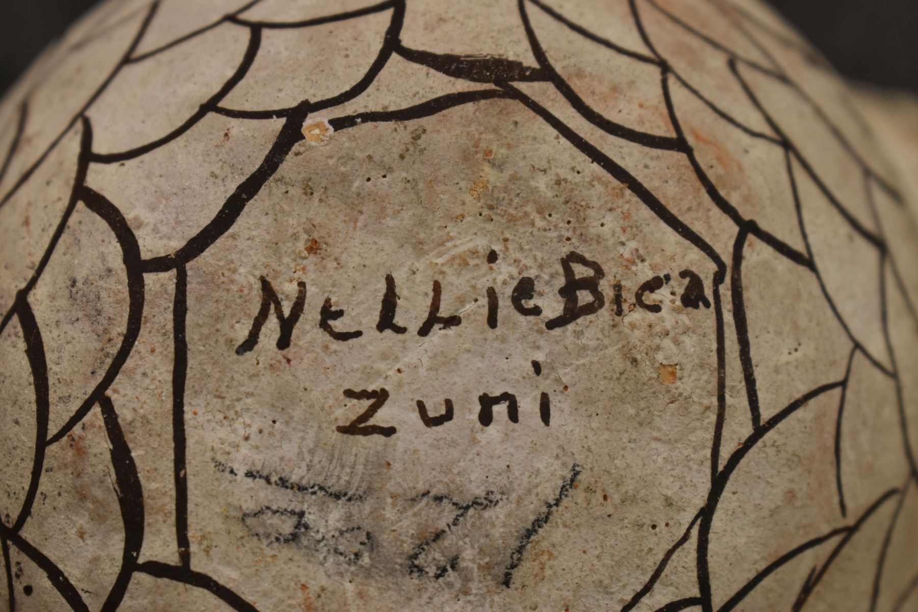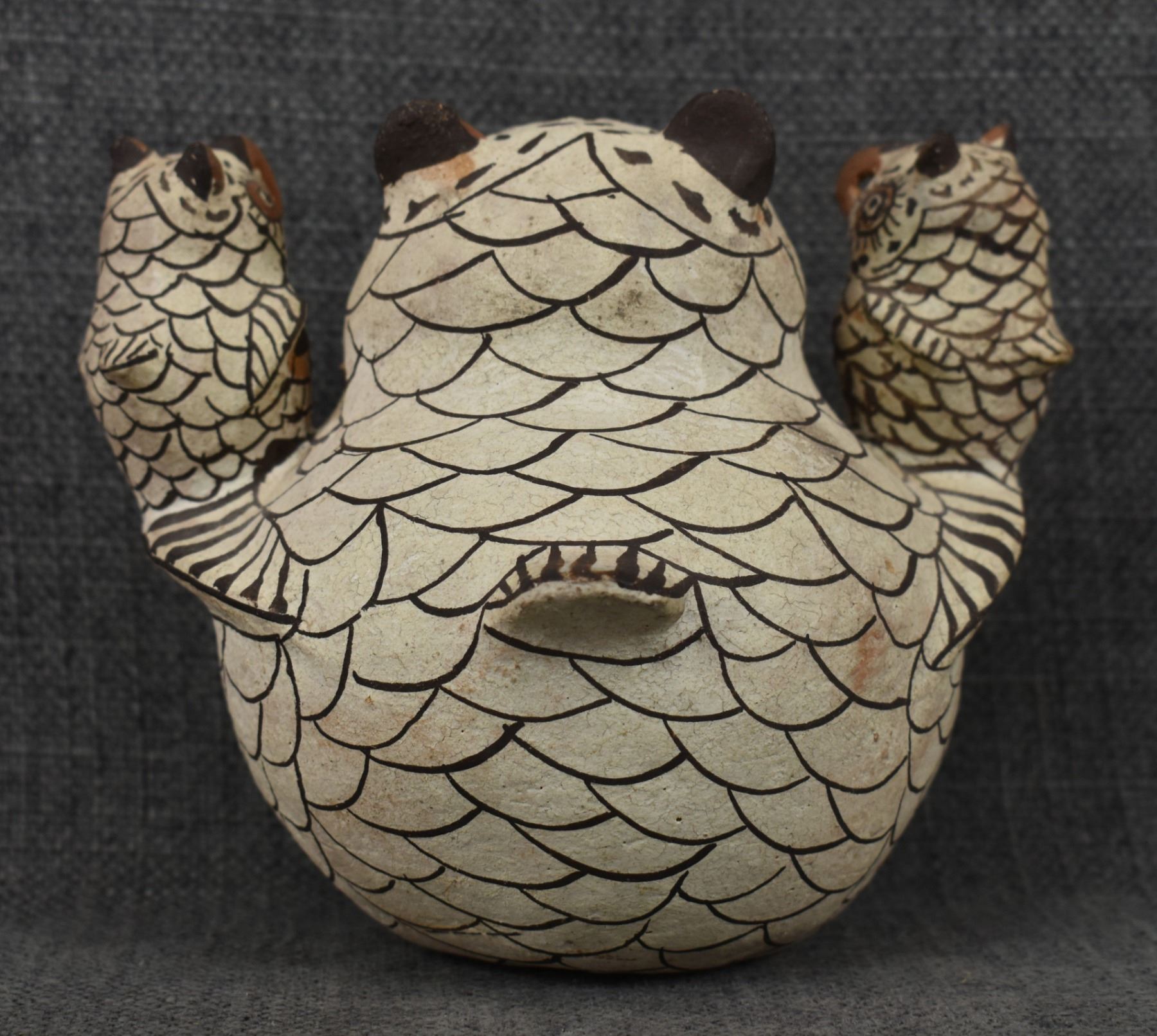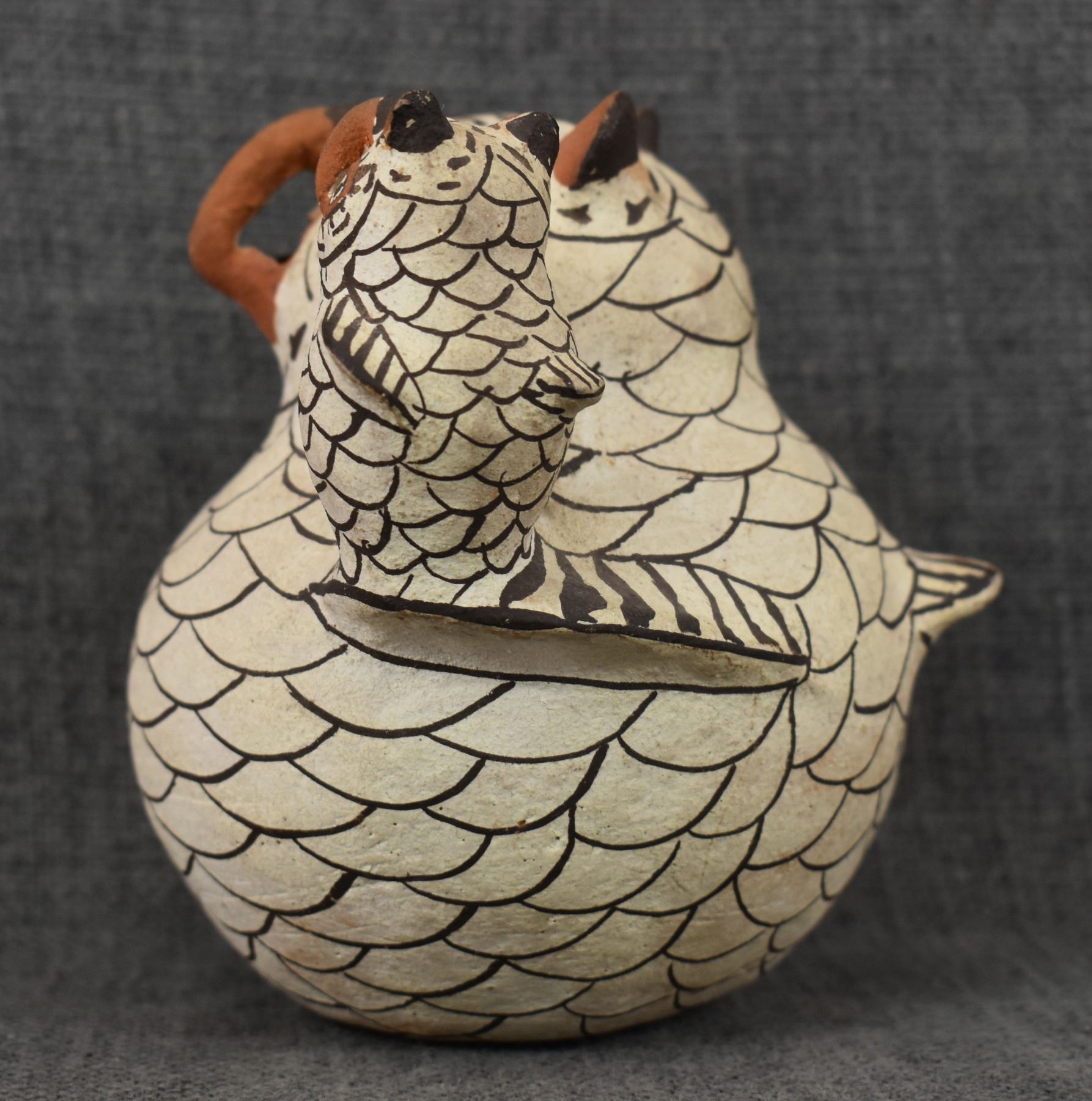 1960's Zuni . Hand coiled and painted pottery owl. Signed Nellie Bica. 5'' x 6'' x 4''
