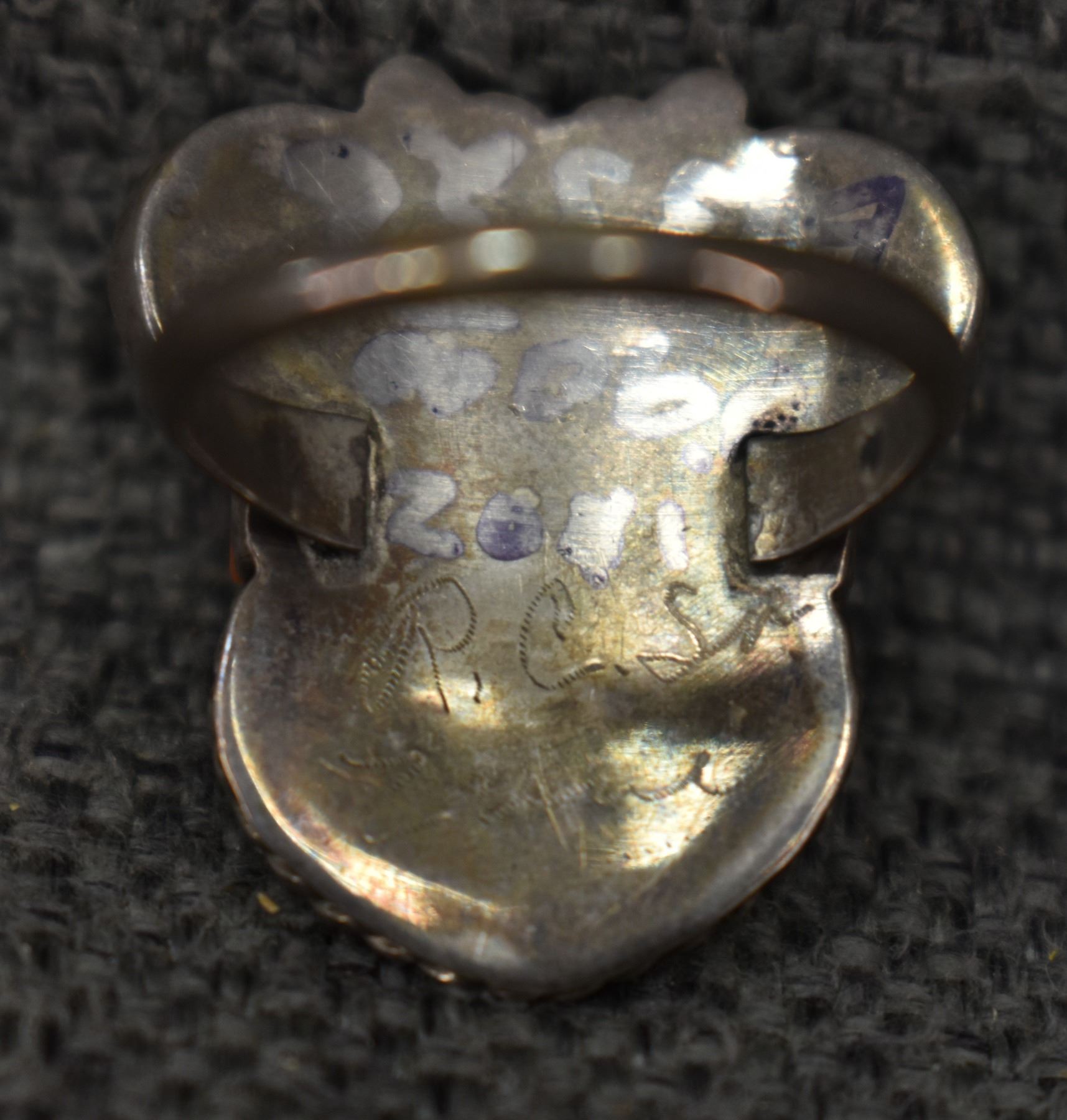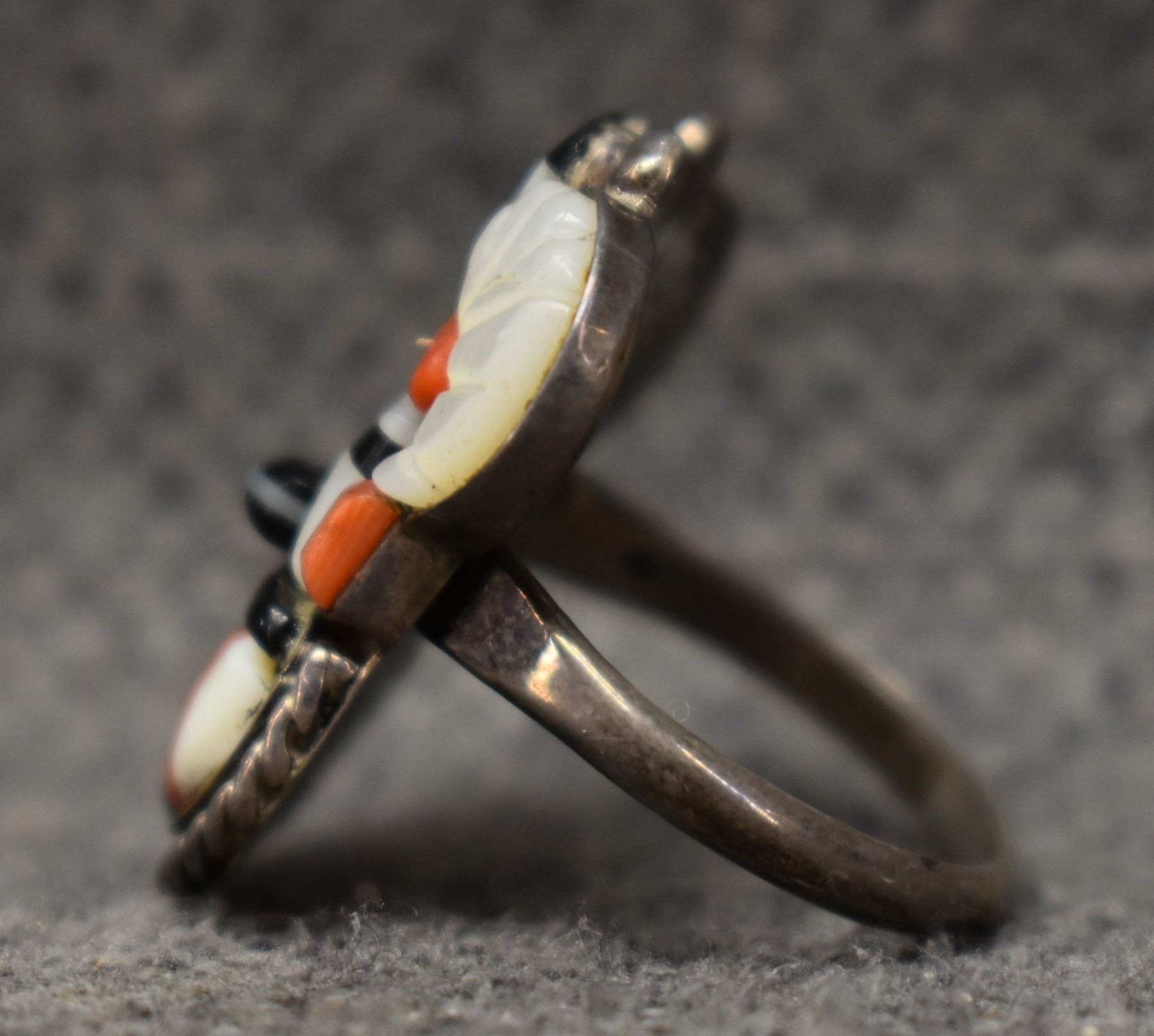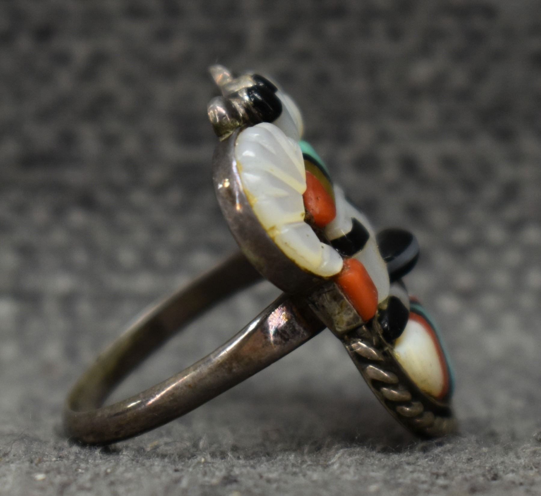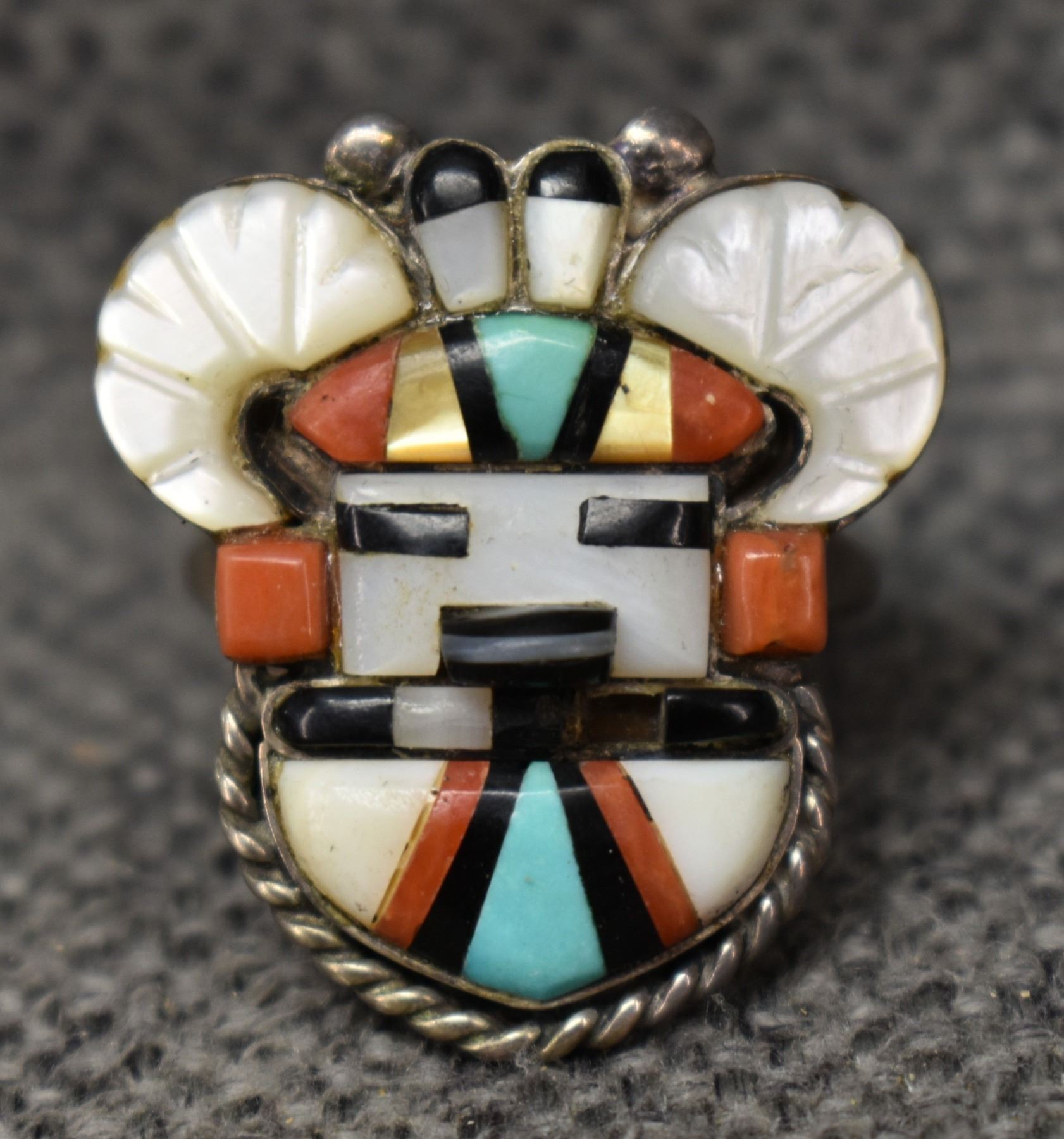 1970's Zuni. Sterling silver turquoise and shell depicting big horn sheep kachina, size 9.5. total weight 8 grams