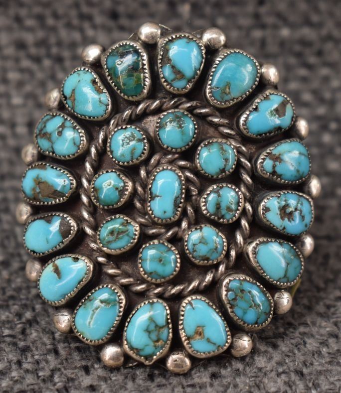 1960's Zuni, sterling silver turquoise cluster design 1.5" x 1.5" size 6 total weight 14 grams