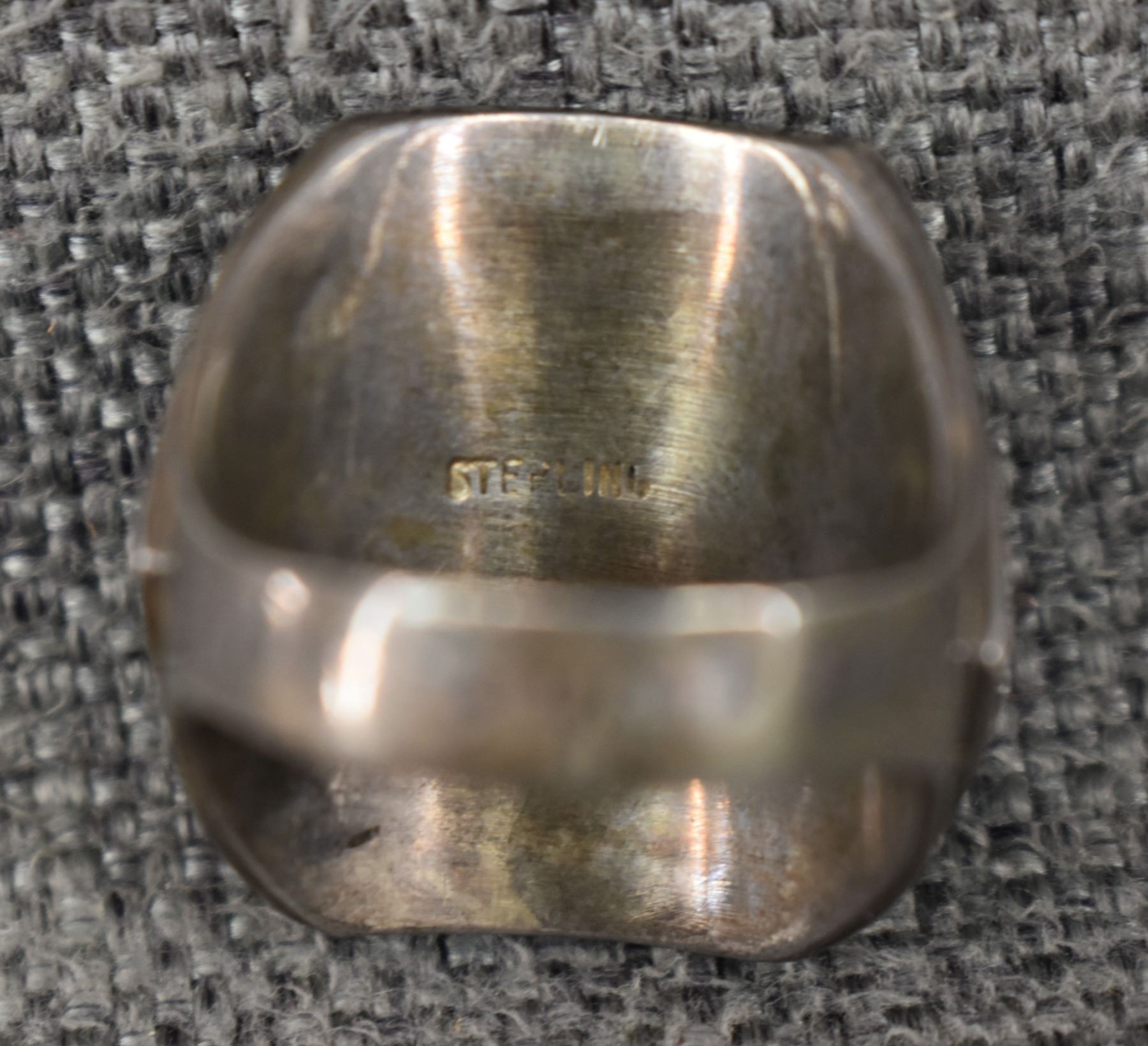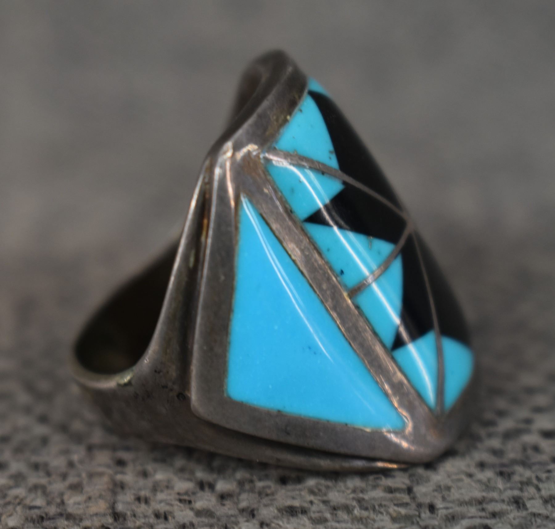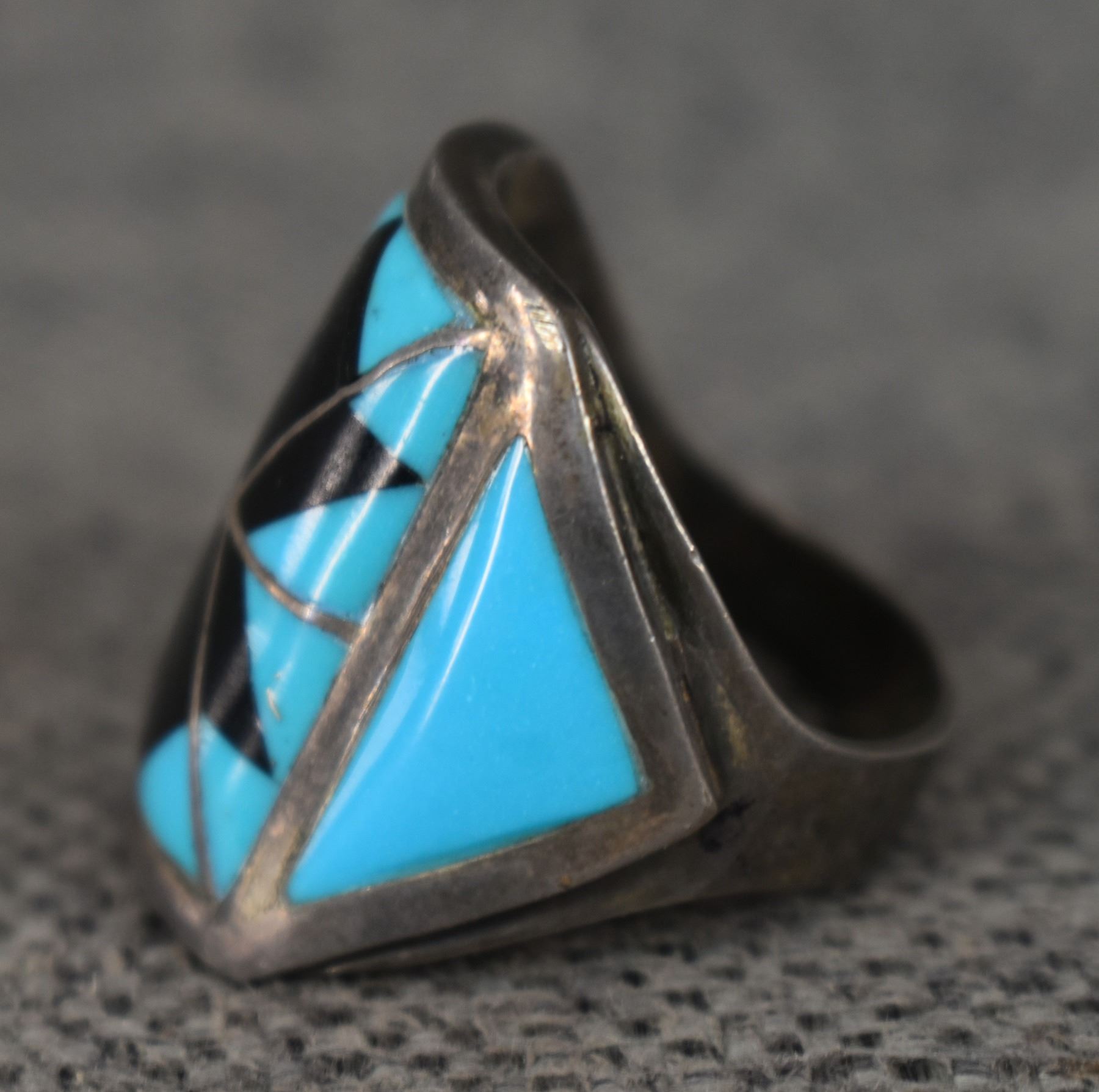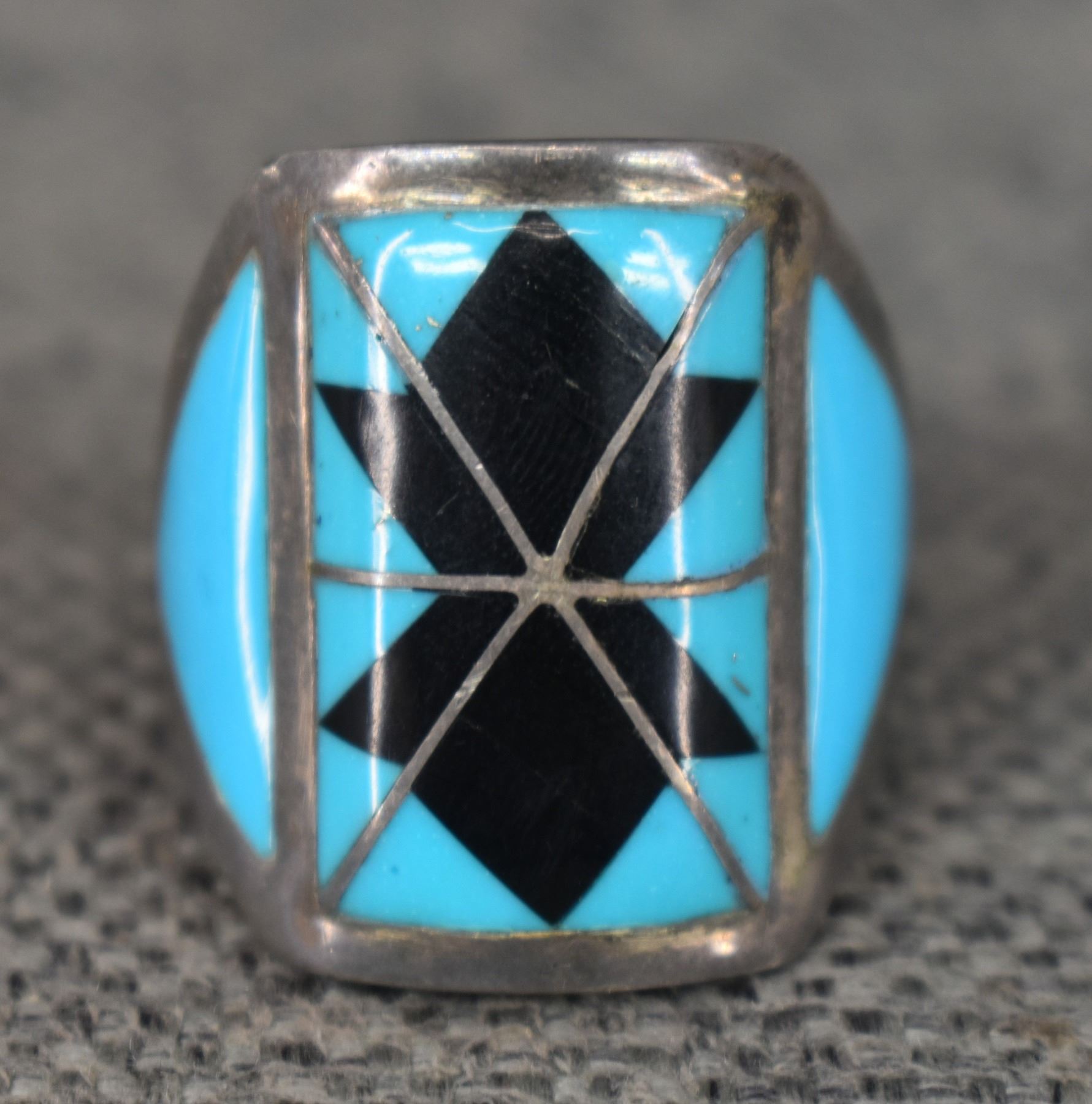 1960's Zuni, sterling silver Channel inlay Turquoise and jet, 1" long size 11.5 total weight 19 grams.