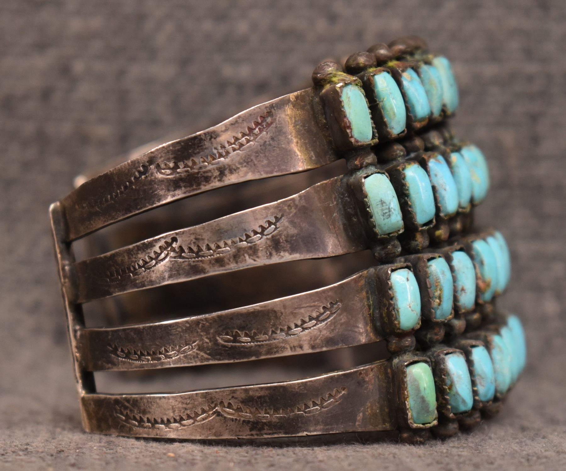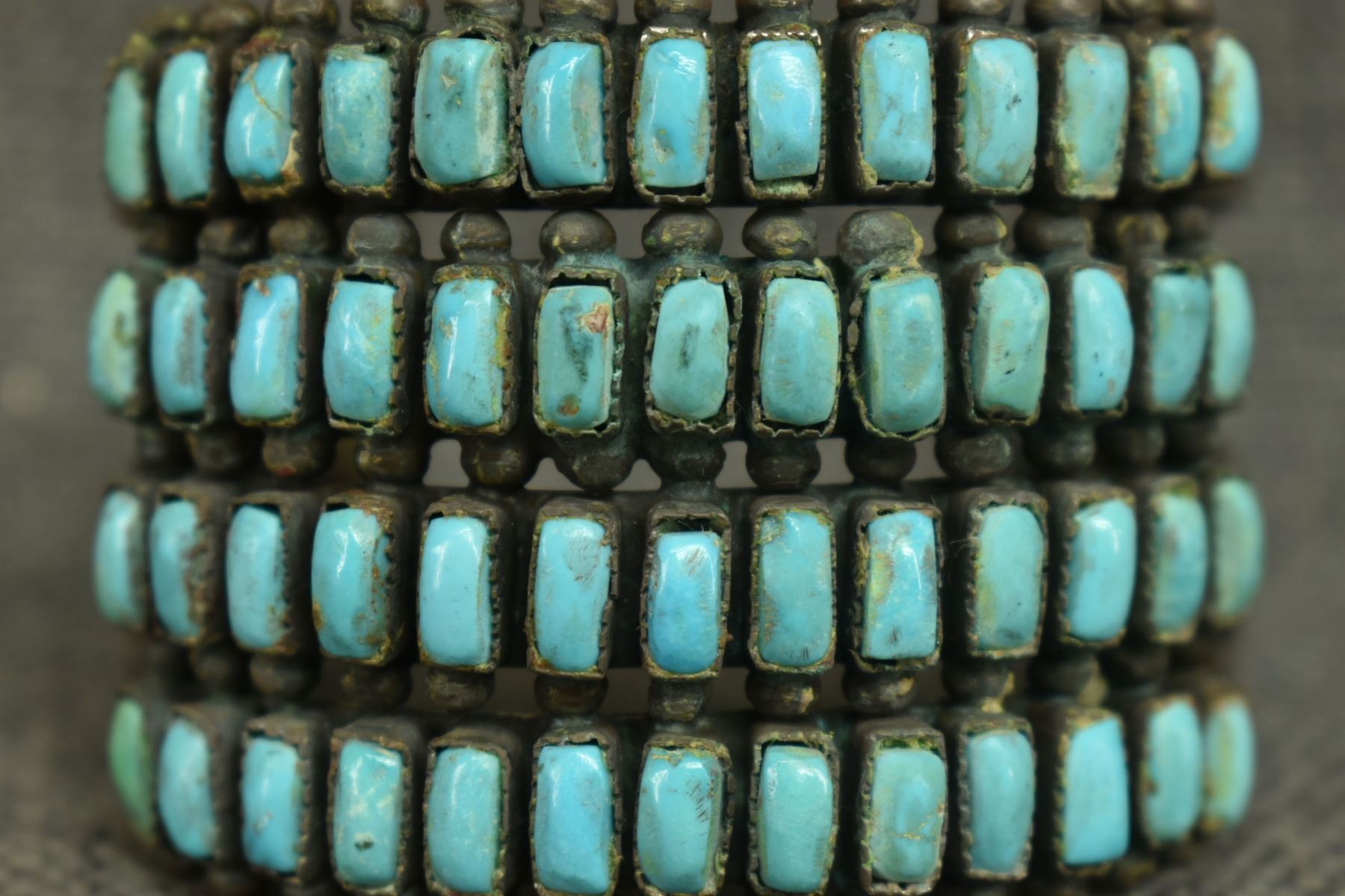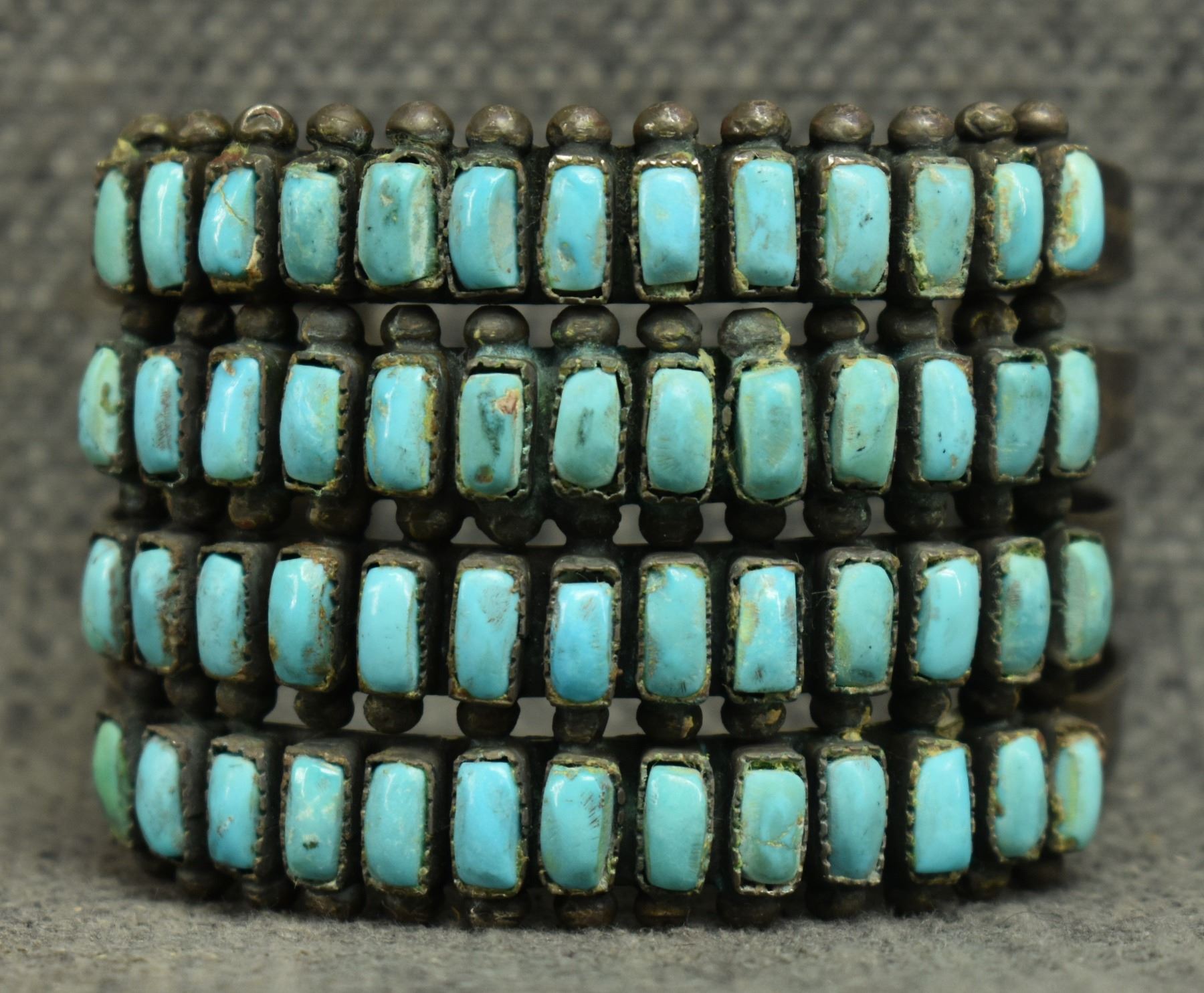 1940's Zuni. Sterling silver and turquoise row bracelet. 2'' x 5.75'' x 1.5''. Total weight. 95 grams