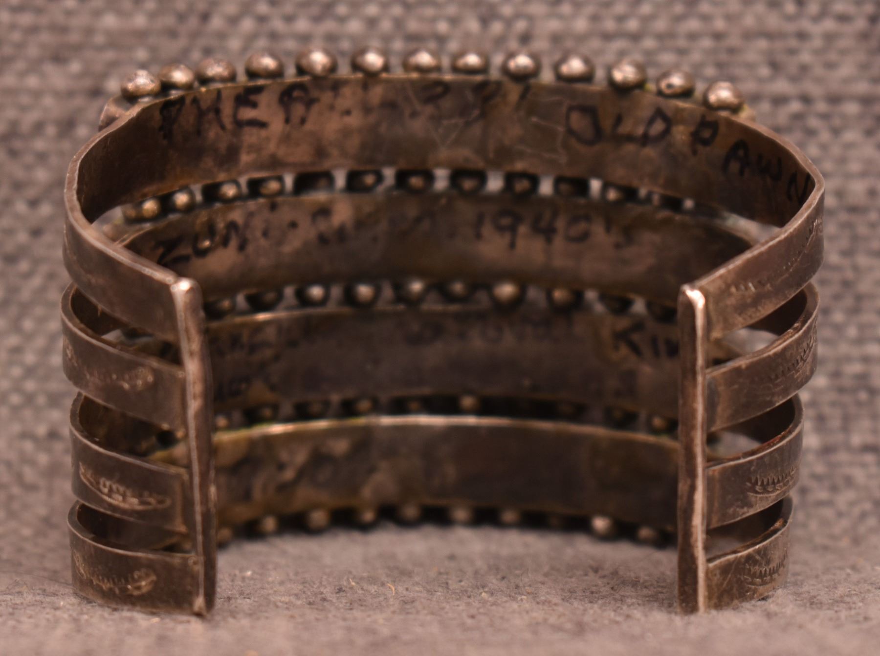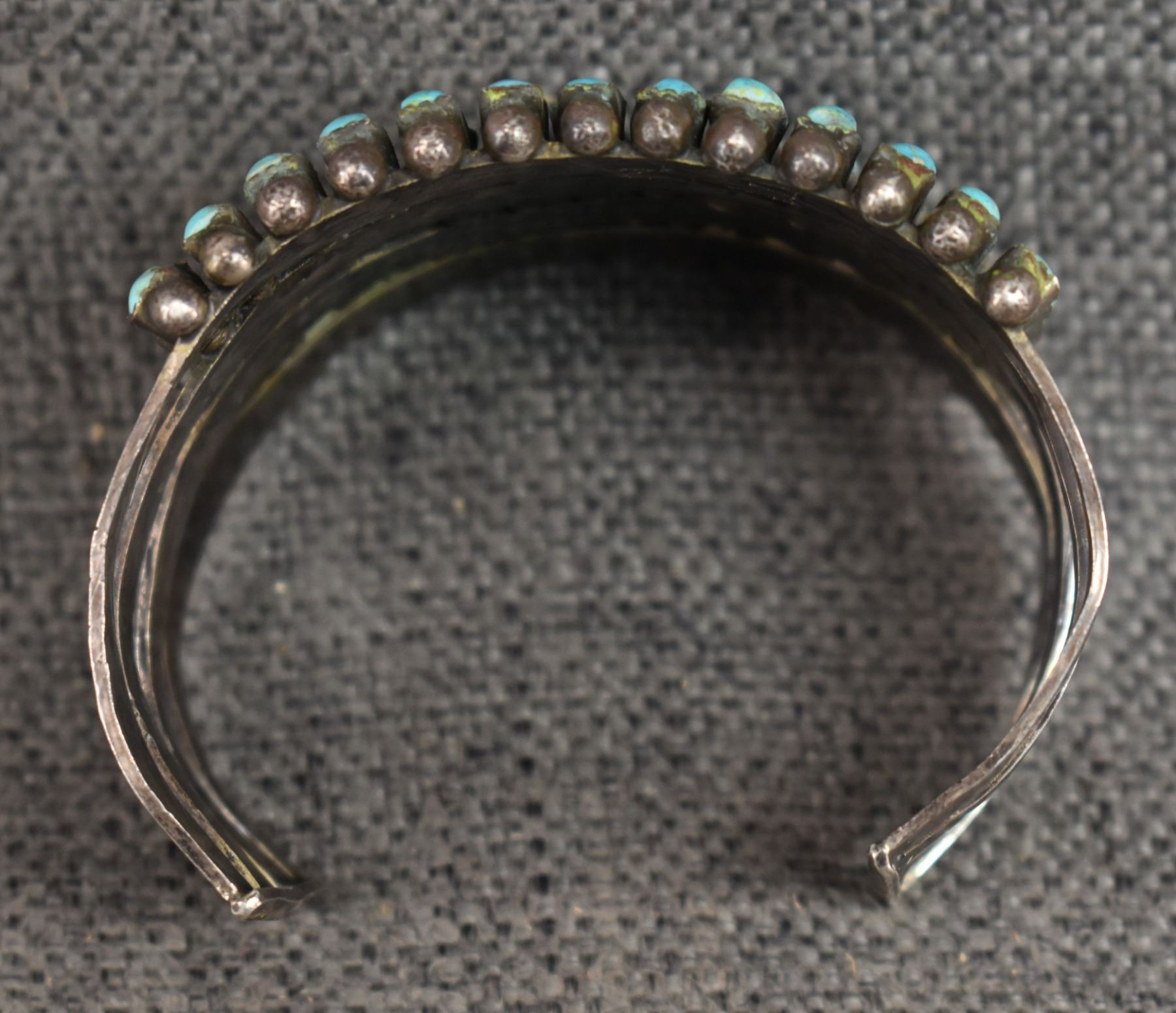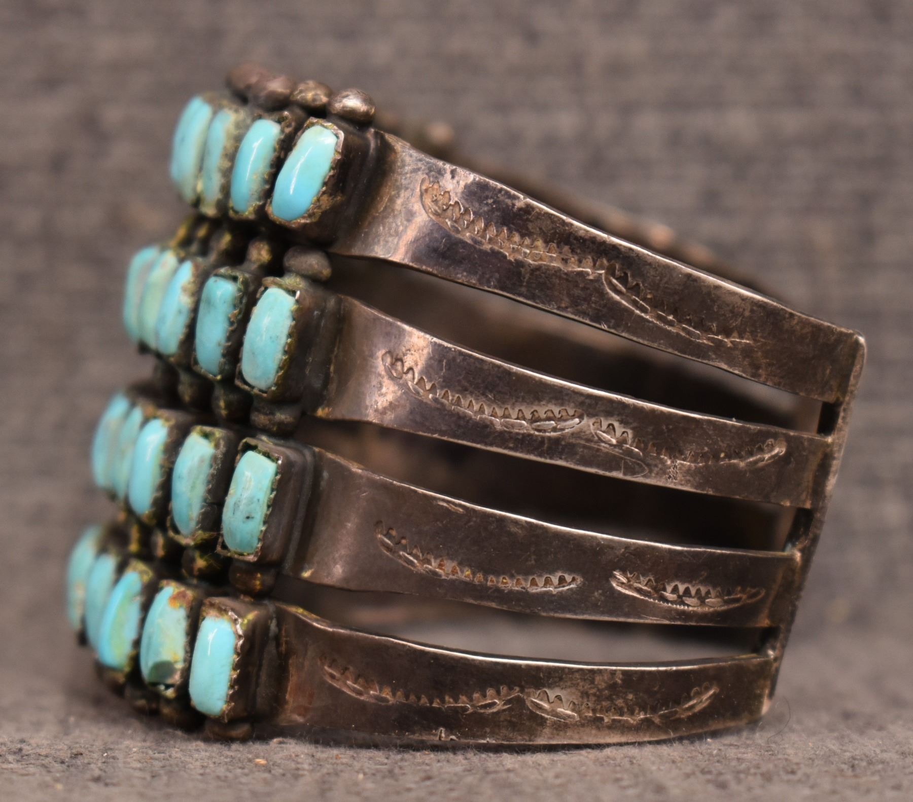 1940's Zuni. Sterling silver and turquoise row bracelet. 2'' x 5.75'' x 1.5''. Total weight. 95 grams