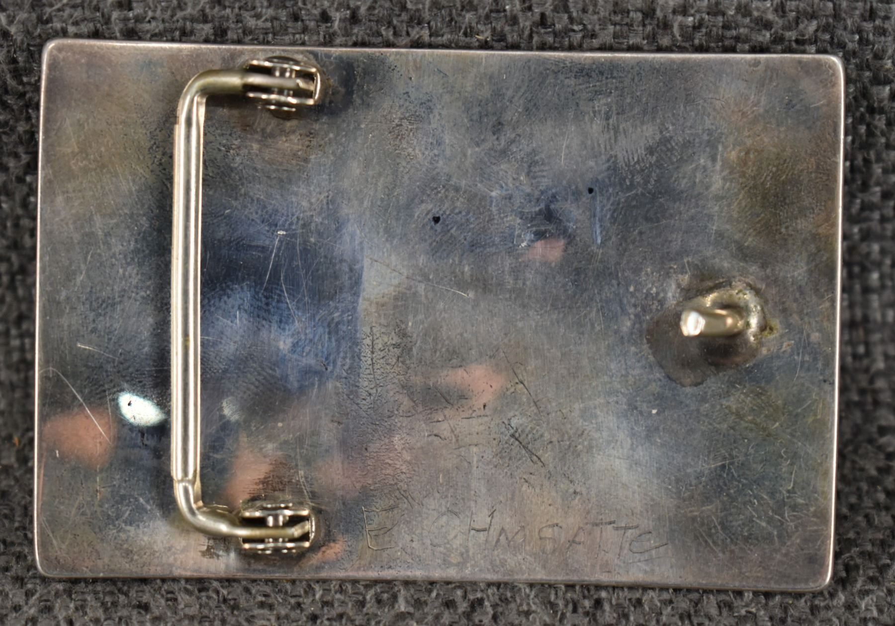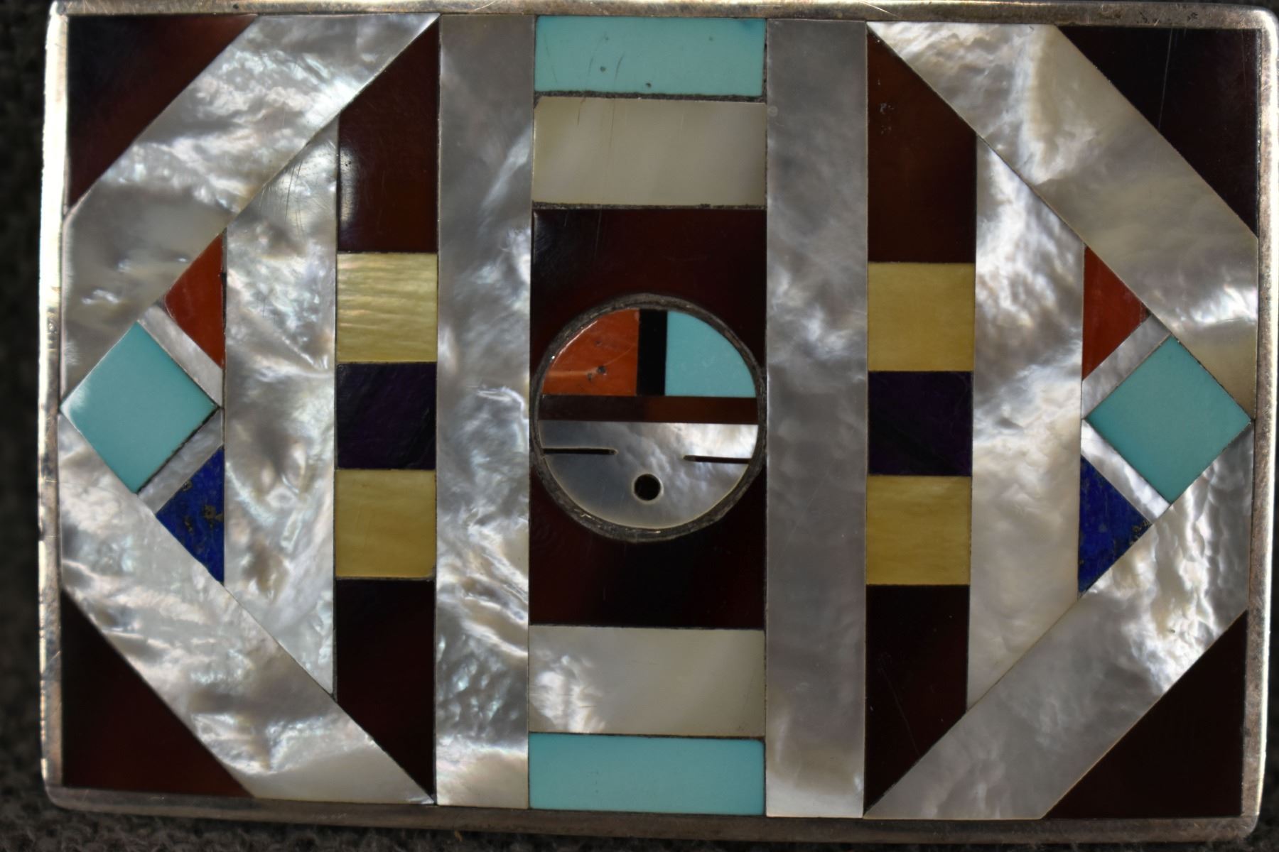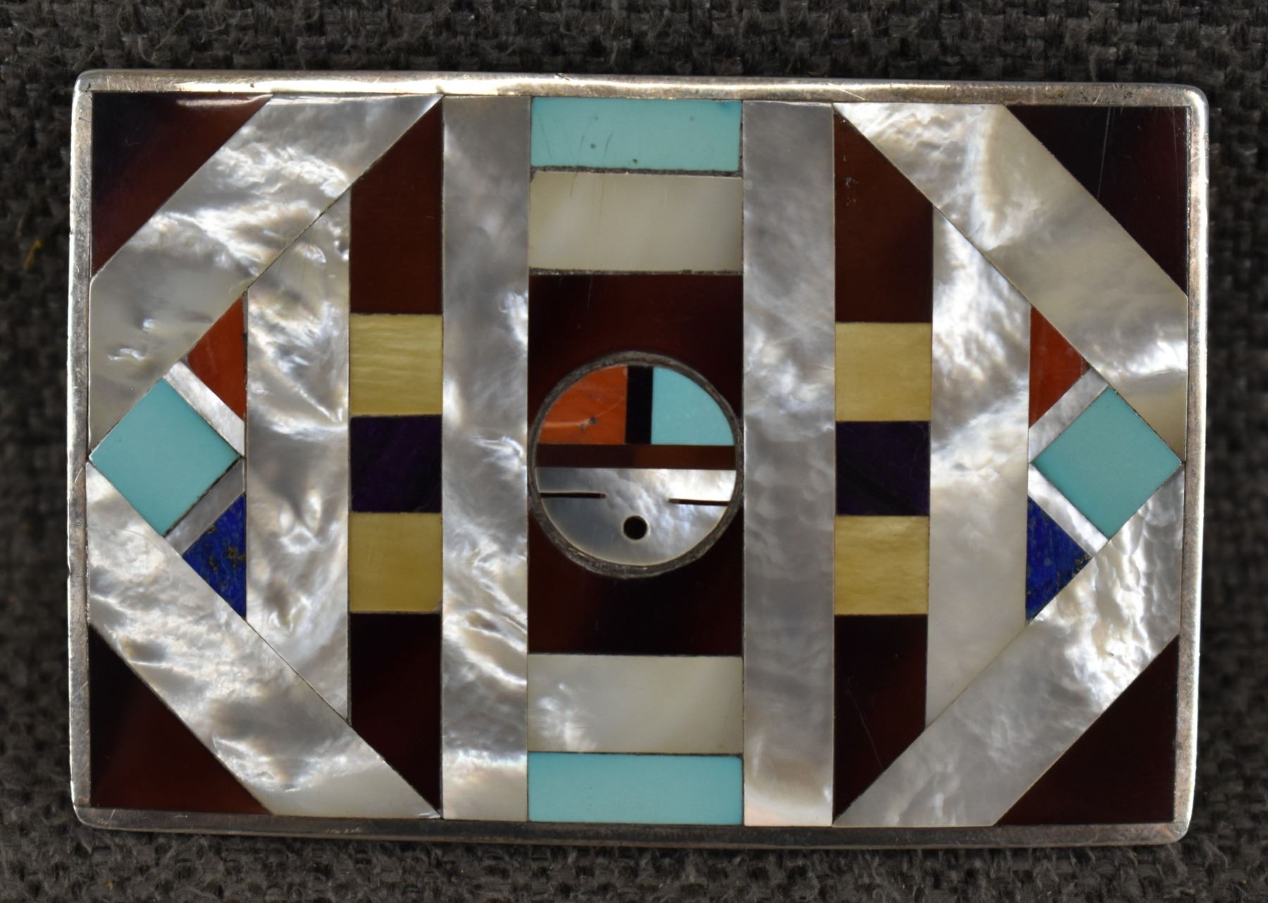 1970s-80s Zuni. channel inlaid turquoise and shell sun face design . by E. Ohmsatte, 2" x 3" made for 1.5'' belt. Total weight 34 grams
