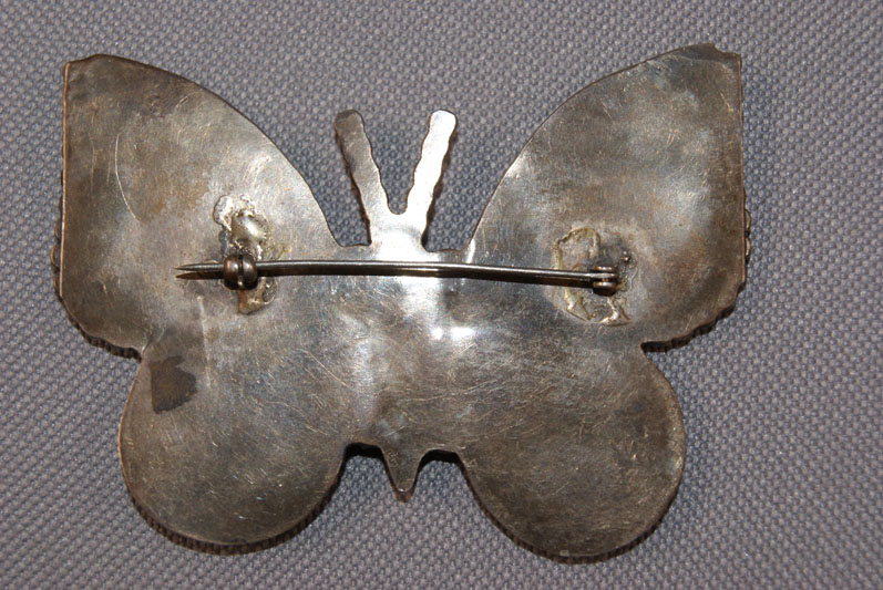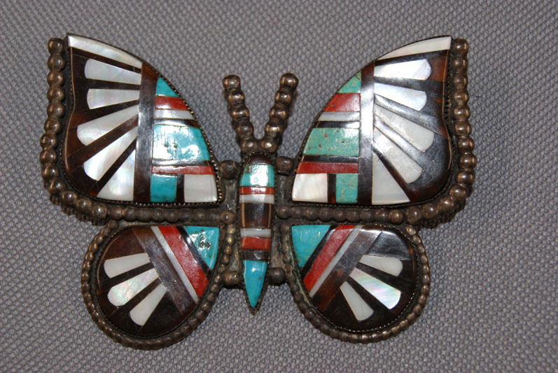 1950s-60s stone to stone inlaid butterfly with turquoise, mother-of-pearl, jet and shell, 2.5" x 3"