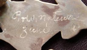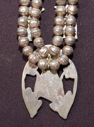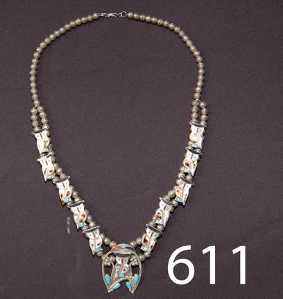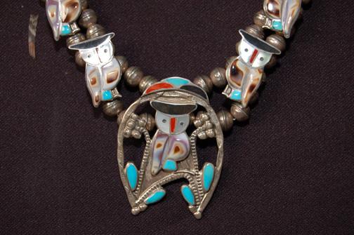 ca. 1970’S sterling, inlaid owls, turquoise, jet, coral & shell, signed Natewa, 23” long.